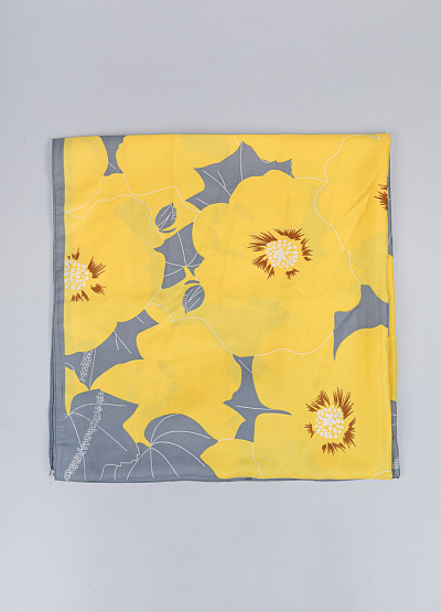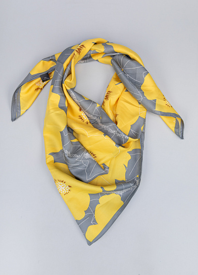 • Платок в солнечно-жёлтой гамме с серыми цветочными акцентами — яркий акцент в образе: