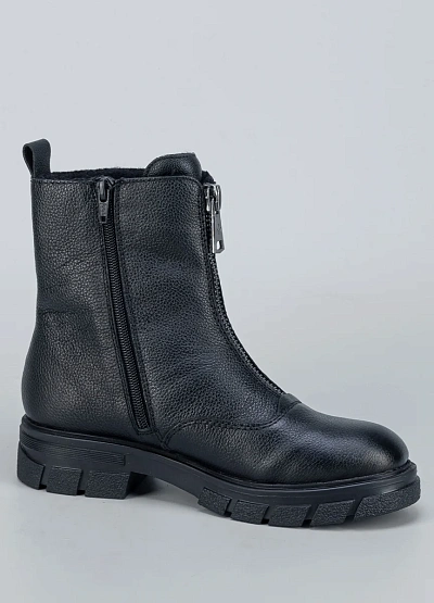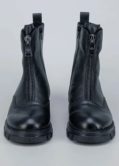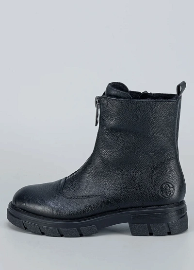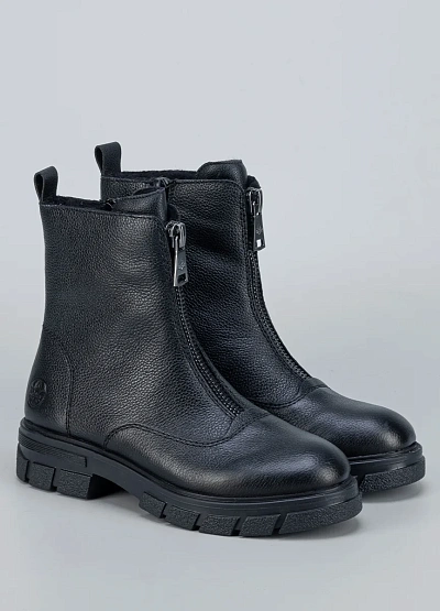 • Женские демисезонные ботинки  Rieker из натуральной кожи с фактурной поверхностью — надежный и практичный выбор на каждый день. Модель выполнена в классическом черном цвете и дополнена удобной молнией спереди, что обеспечивает легкость надевания и снимает обувь. Утолщенная подошва с протектором гарантирует хорошее сцепление и комфорт при ходьбе, а мягкая внутренняя отделка дарит тепло и уют в прохладную погоду.