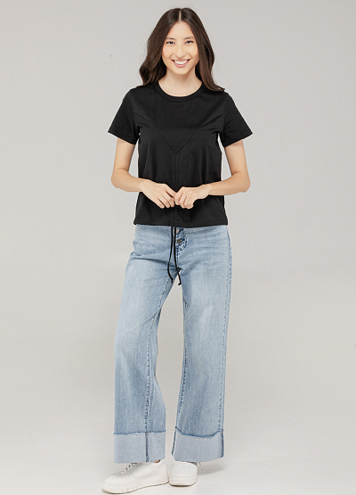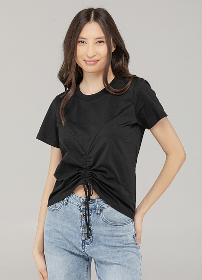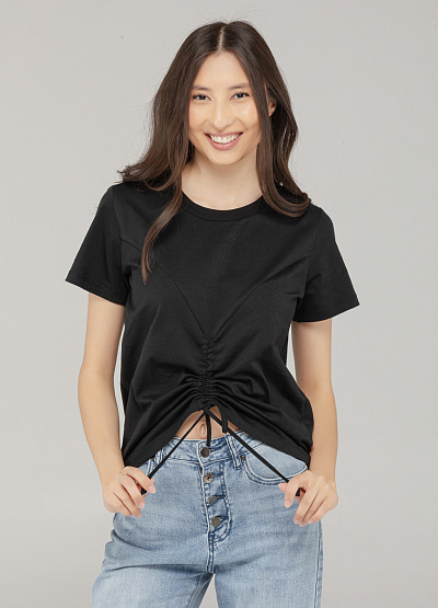 • Трендовая чёрная футболка с акцентной сборкой спереди — стильная и смелая интерпретация базового фасона. Благодаря регулируемым завязкам вы можете сами выбирать глубину драпировки, создавая более приталенный силуэт и подчёркивая талию. Модель выполнена из мягкого хлопка с добавлением эластана для комфорта и эластичности.