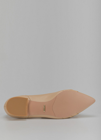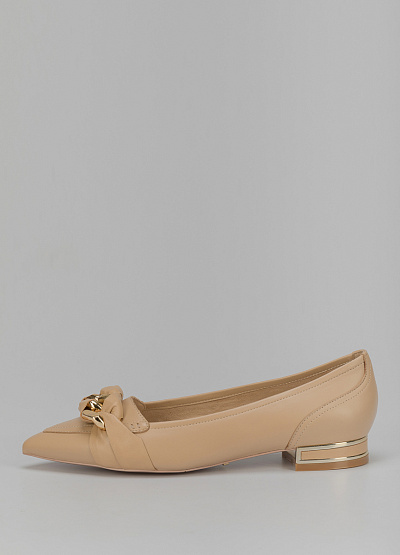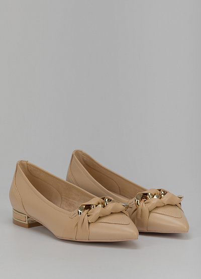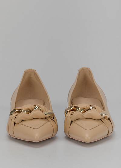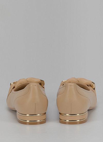 • Женские балетки бежевого цвета из натуральной кожи от итальянского бренда Franco Manatti. Заостренный носок. На передней части лента, вплетенная в металлическую цепь. Тонкая подошва с низким декорированным каблуком.