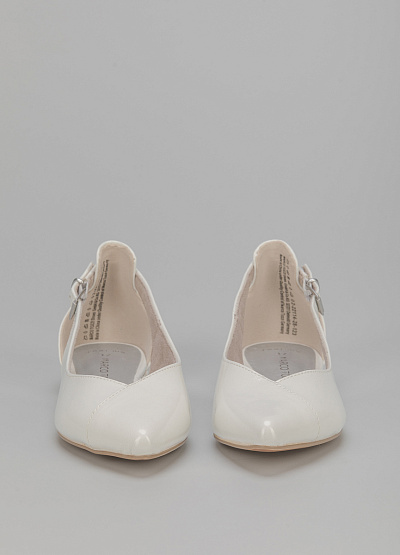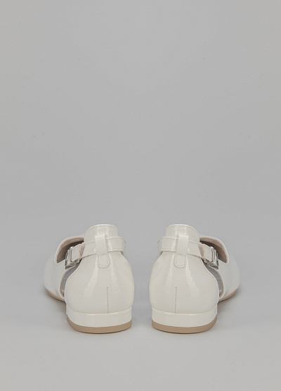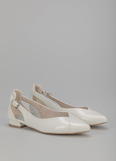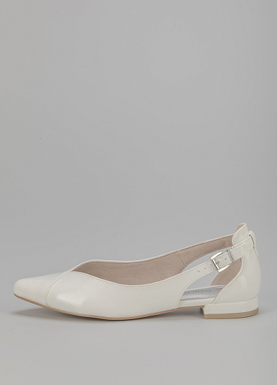 • Балетки белого цвета от бренда Marco Tozzi. Модель с заостренным носком. Застежка-ремешок на щиколотке. Сквозное пространство в области пяток. Тонкая подошва с низким каблуком.