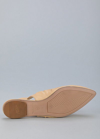 • Открытые балетки из натуральной кожи от бренда Tamaris. Модель с открытой пяткой. Заостренный носок. Ремешок на щиколотке. Плоская подошва с низким каблуком.