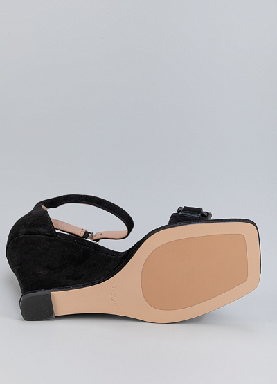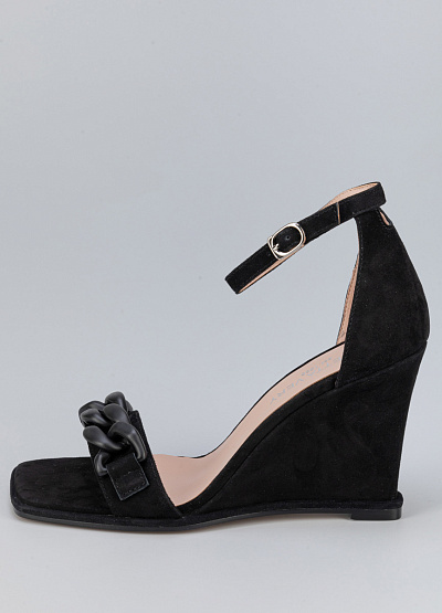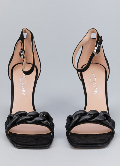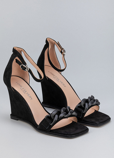 • Женские босоножки черного цвета из натуральной замши от бренда Loretta Very. Элегантная модель с ремешками и открытым носом – классика на все времена. Эти босоножки с квадратным носом, высокой танкетке и декоротивной цепью подойдут для создания невероятно красивых вечерних образов.