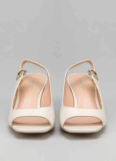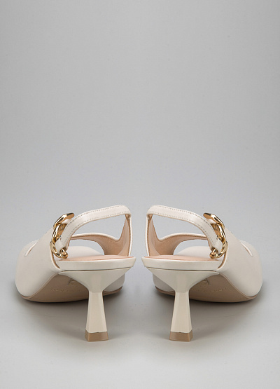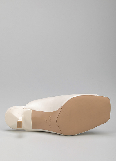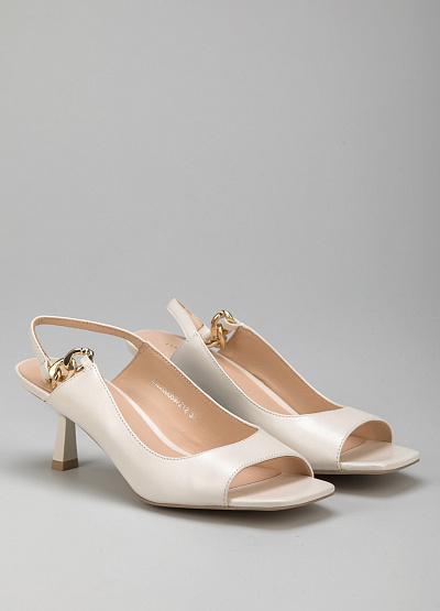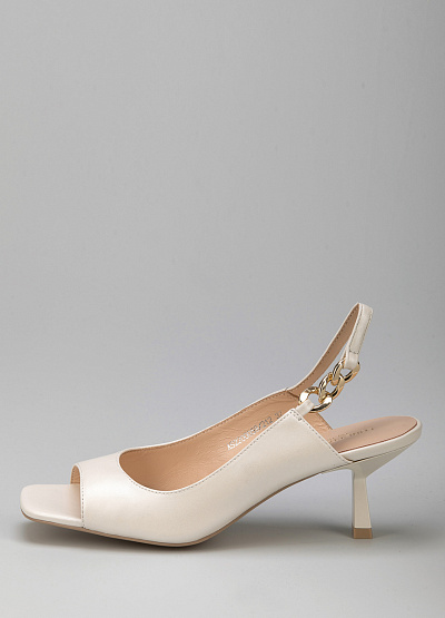 • Босоножки белого цвета из натуральной кожи от бренда Loretta Very. Модель с открытым, квадратным мысом. На застежке декор в виде цепи. Застежка-ремешок. Средний каблук.