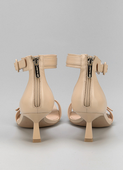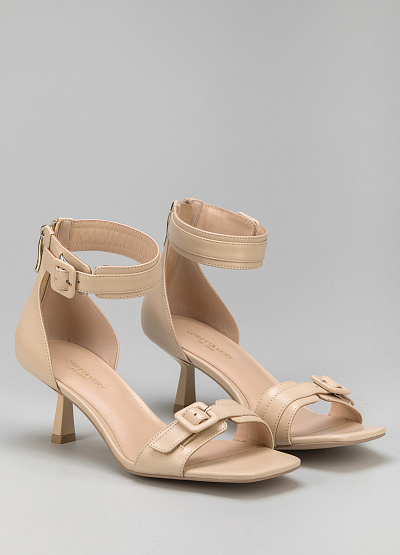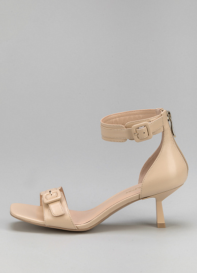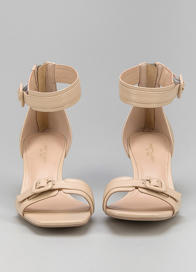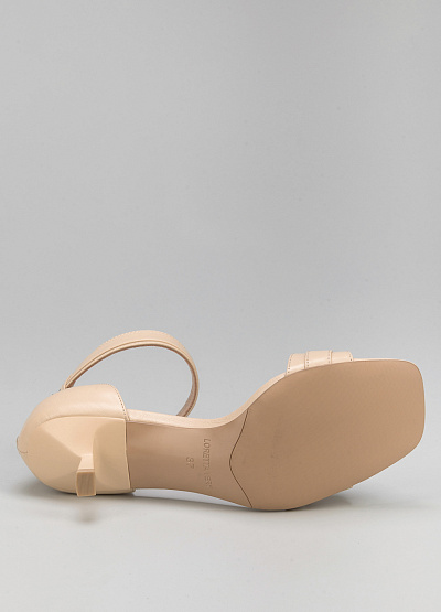 • Босоножки бежевого цвета из натуральной кожи от бренда Loretta Very. Модель с открытым мысом и закрытой пяткой. Застежка-ремешок на щиколотке. Замок сзади. Средний каблук.