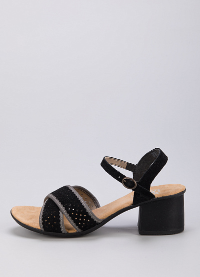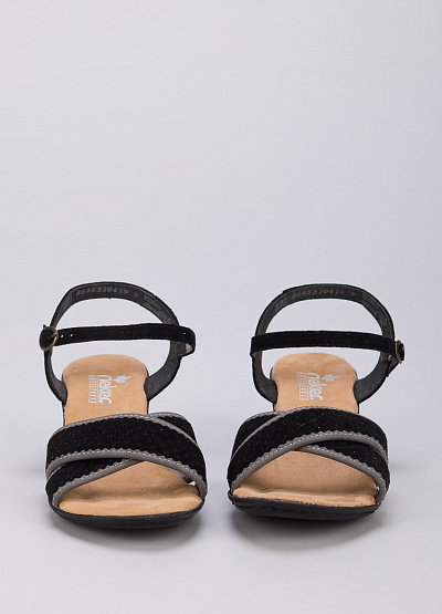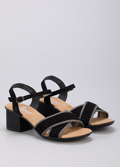 • Босоножки из натуральной кожи и экокожи от бренда Rieker. Перекрещивающиеся ремешки. Застежка-ремешок на щиколотке. Устойчивый средний каблук.