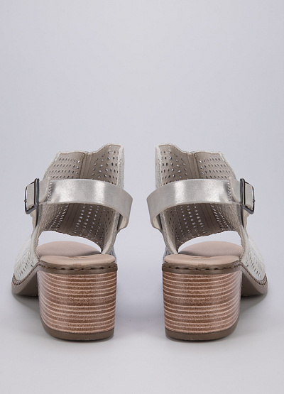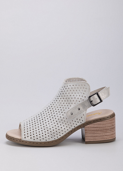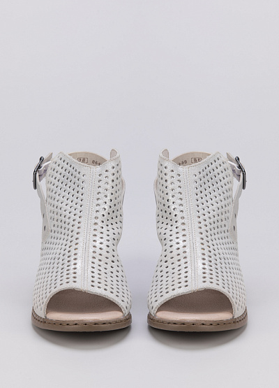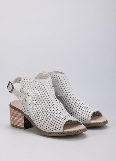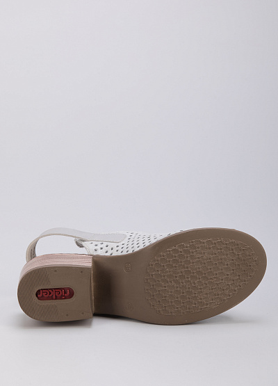 • Босоножки из натуральной кожи и экокожи от бренда Rieker. Открытый мыс. Закрытый подъем. Сквозная перфорация. Застежка-ремешок на щиколотке. Устойчивый средний каблук.