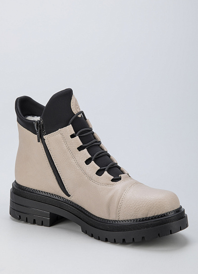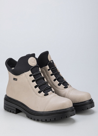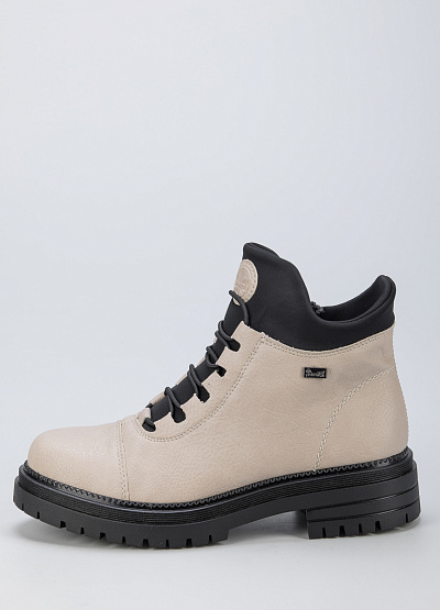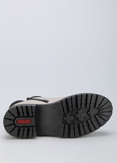 • Женские ботинки из экокожи и текстиля от бренда Rieker. Закругленный носок. Мыс оформлен рельефным швом. Открытая шнуровка. Боковая молния. Язычок и боковая часть украшены логотипом. Массивная рифленая подошва на низком каблуке.