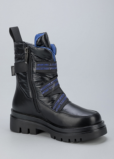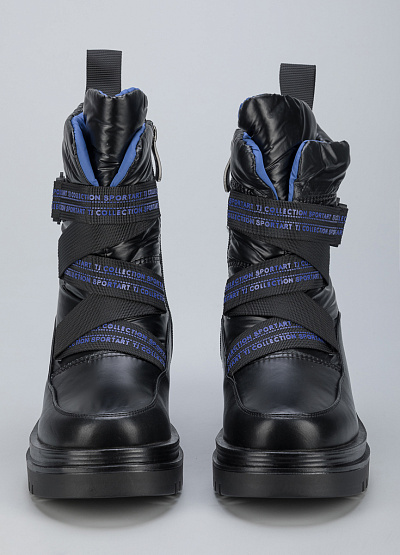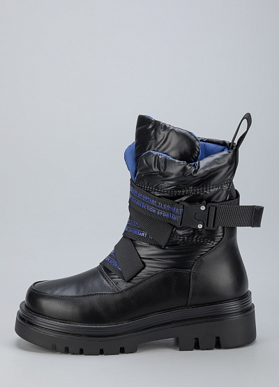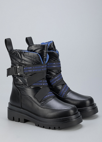 • Женские дутыши из экокожи и текстиля от бренда Finn Line. Открытая шнуровка в виде ленты с пряжкой. Закругленный носок. Мыс оформлен рельефным швом. Боковая молния. Петли для подтягивания сзади. Массивная рифленая подошва.