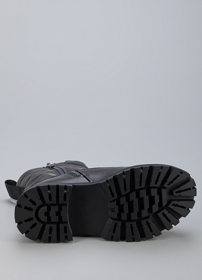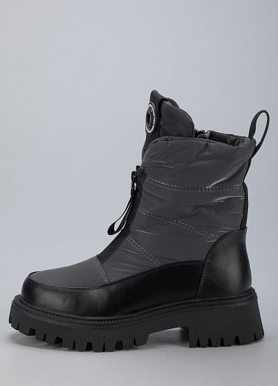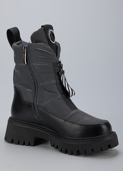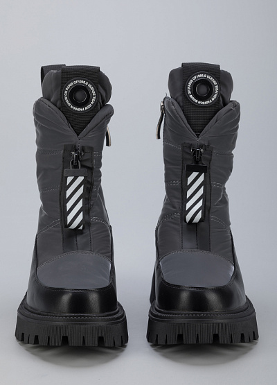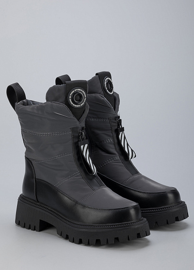 • Женские дутыши из экокожи и текстиля от бренда Finn Line. Закругленный носок. Мыс оформлен рельефным швом. Застежка на молнии с брелком по центру. Петли для подтягивания сзади. Логотип на язычке. Массивная рифленая подошва.