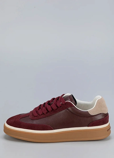 • Мужские кроссовки бордового цвета с гладкой кожаной основой и замшевыми вставками. Модель выполнена в минималистичном дизайне с низкой посадкой и удобной шнуровкой. Контрастная бежевая вставка на пятке и светло-коричневая подошва делают образ более интересным. Удобная колодка и качественные материалы обеспечивают комфорт на весь день.