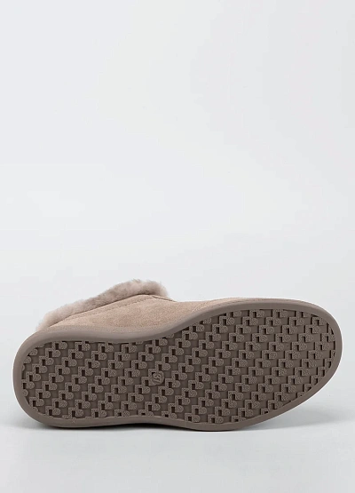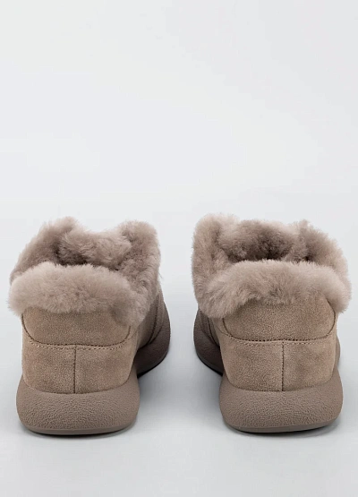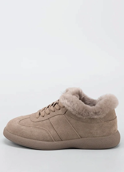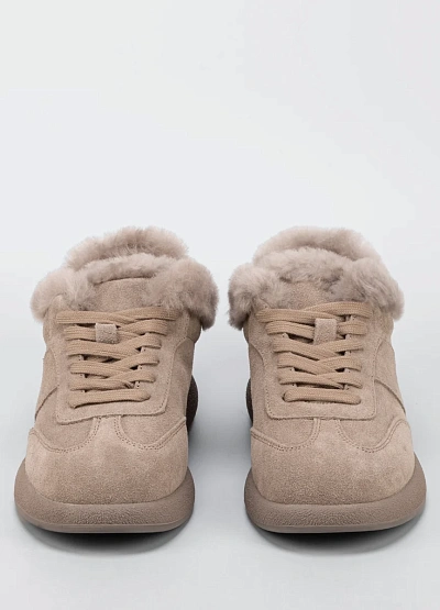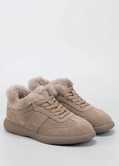 • Женские утеплённые кроссовки в нежном бежевом оттенке — практичный и уютный вариант для холодного сезона. Модель выполнена из мягкой замши и дополнена объёмной меховой опушкой по краю, которая обеспечивает дополнительное тепло и комфорт. Классическая шнуровка надёжно фиксирует стопу, а лаконичный дизайн делает обувь универсальной для повседневного гардероба.