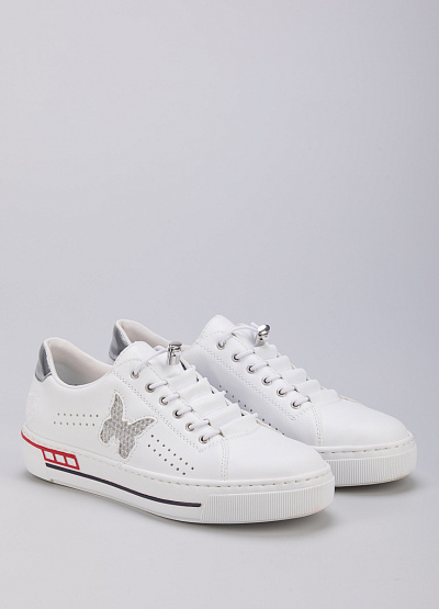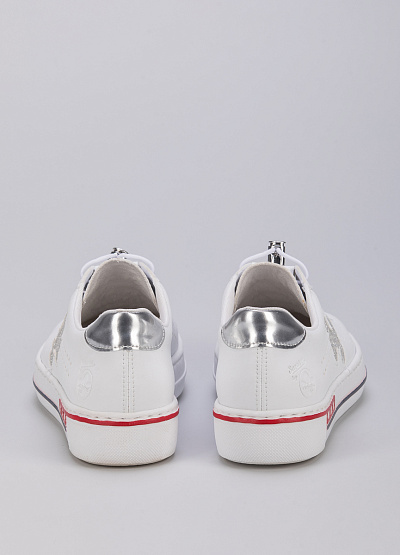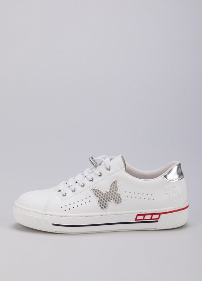 • Женские кеды из экокожи от бренда Rieker. Закругленный носок. Открытая шнуровка на кулиске. Сквозная перфорация. Боковая часть украшена принтом. Плоская подошва с контрастными полосками.