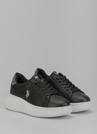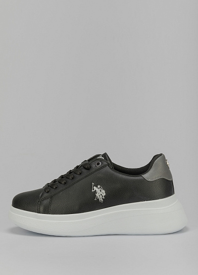 • Женские кеды черного цвета от бренда US Polo. Модель выполнена из экокожи. Закругленный носок, открытая шнуровка в тон. Задник декорирован логотипом. Плоская подошва белого цвета.