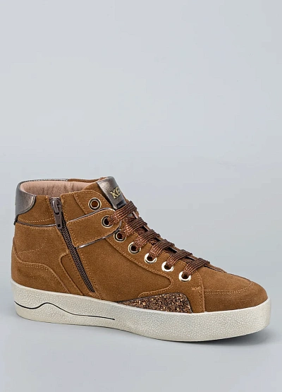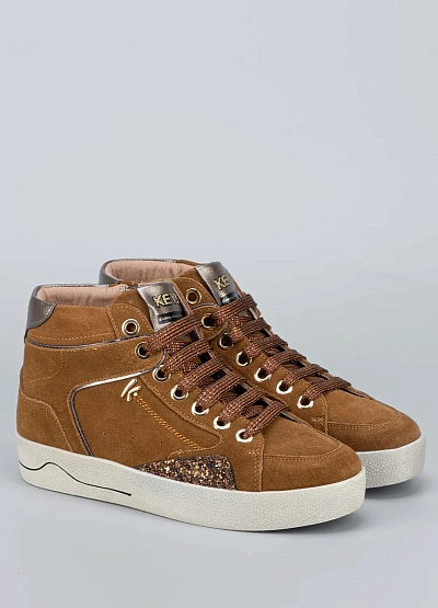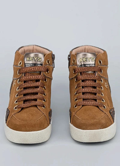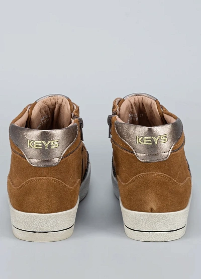 • Эти высокие кеды от бренда KEYS выполнены из мягкой замши тёплого рыже-коричневого оттенка с эффектными деталями: блестящая вставка у основания и металлизированный кант придают модели выразительность. Удобная шнуровка сочетается с комфортной посадкой, а внутренняя отделка — с ощущением тепла и уюта в холодный сезон.