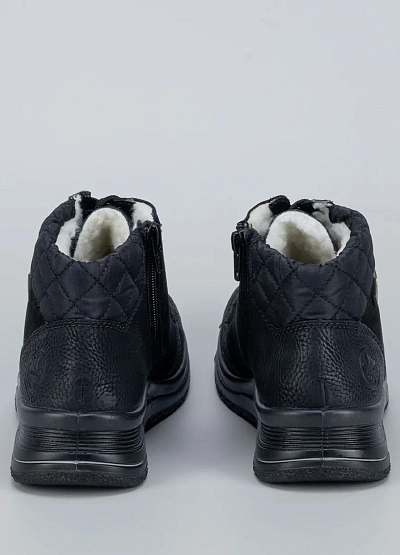 • Практичные и стильные женские кроссовки от бренда Rieker — отличное решение для холодного времени года. Удобная шнуровка и боковая молния обеспечивают комфортную посадку, а утеплённая внутренняя отделка сохранит тепло. Модель выполнена в универсальном чёрном цвете с золотистой фурнитурой и фактурной отделкой по канту.