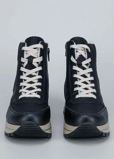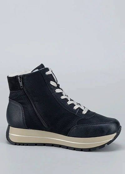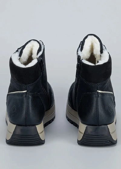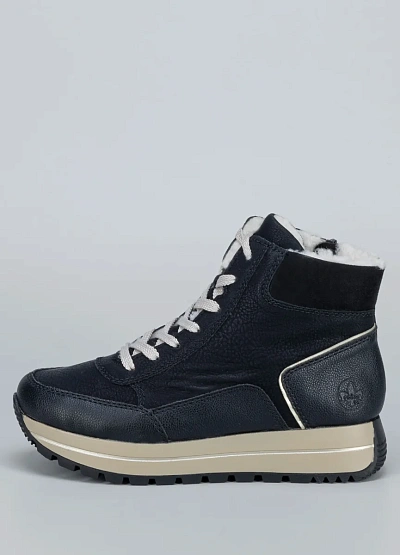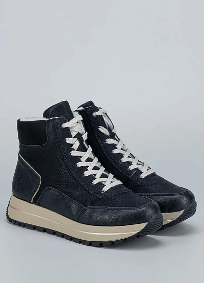 • Женские зимние кроссовки от бренда Rieker сочетают в себе элегантность и практичность. Глубокий тёмно-синий цвет в тандеме с кремовой подошвой создаёт выразительный и современный образ, а утеплённая внутренняя часть гарантирует тепло в любой мороз.