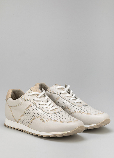• Комбинированные женские кроссовки от бренда Tamaris. Модель выполнена из кожи. Закругленный носок, открытая шнуровка в тон. Плоская рифленая подошва.