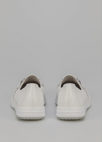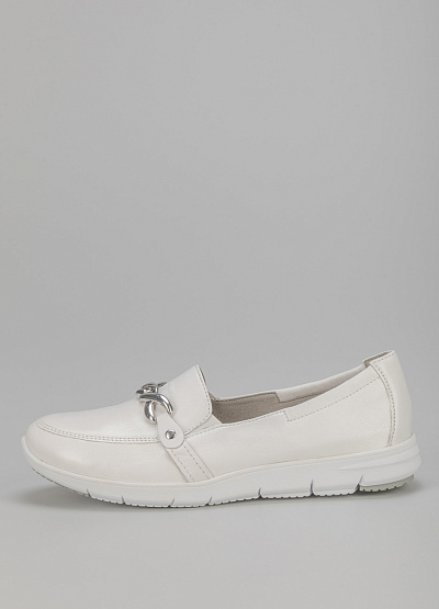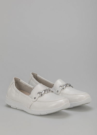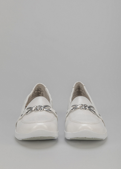 • Женские мокасины белого цвета из натуральной кожи от бренда Caprice. Модель с язычком, дополнена декором в виде перемычки с цепью на подъеме. Закругленный носок. Мыс оформлен рельефным швом. Плоская рифленая подошва.