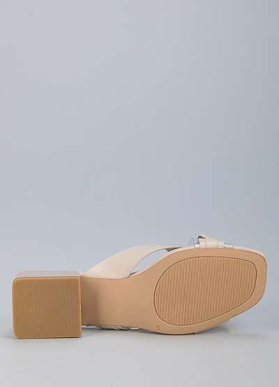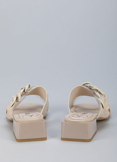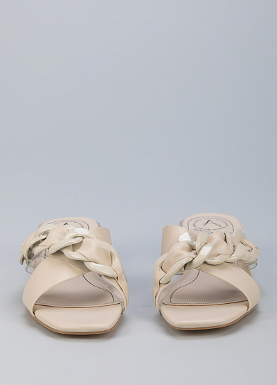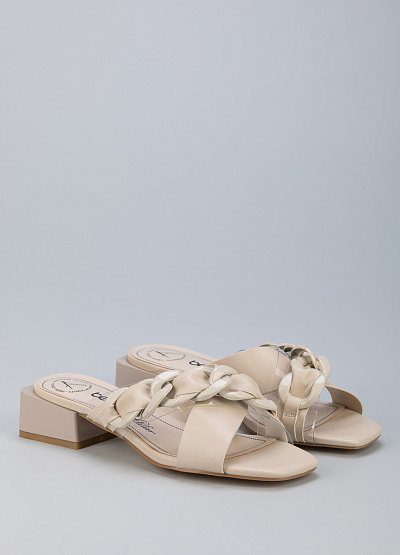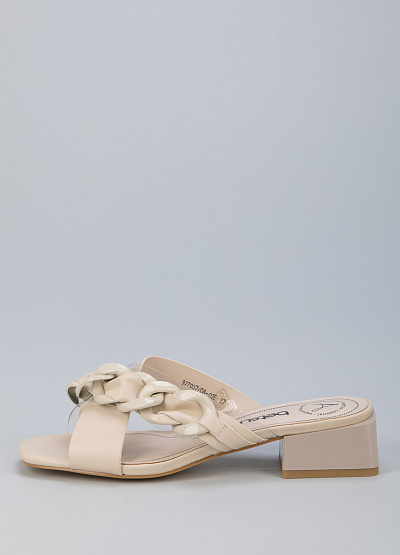 • Мюли из экокожи от бренда Betsy. Модель с перекрещивающимися ремешками. Декор в виде цепи в тон с прозрачной вставкой. Низкий квадратный каблук.