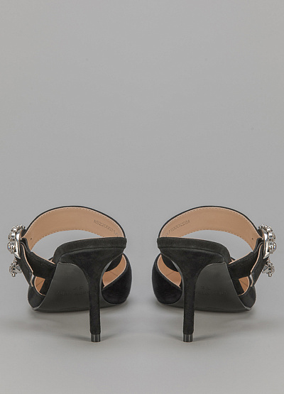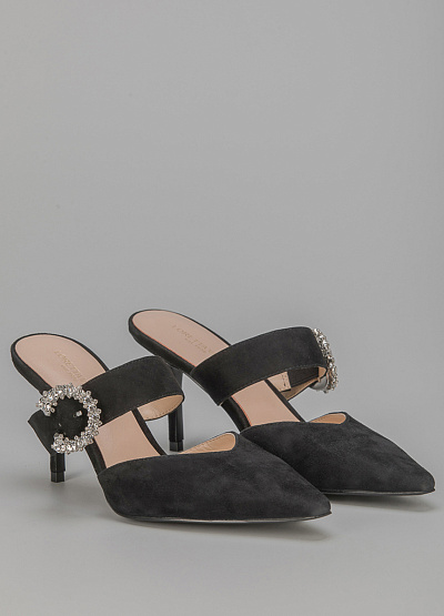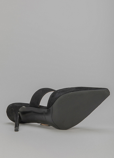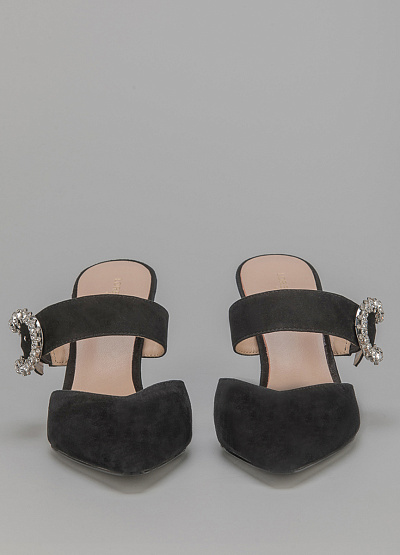• Мюли из замши черного цвета от бренда Loretta Very. Модель с заостренным носком. Каблук средней высоты.