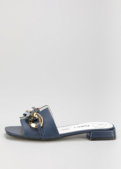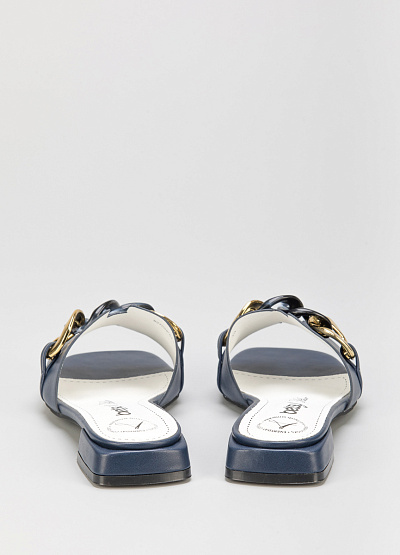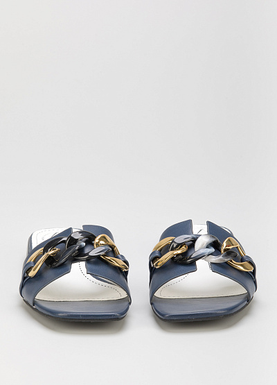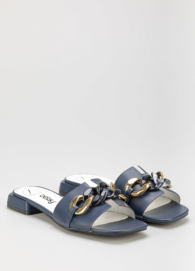• Пантолеты из экокожи от бренда Betsy. Модель с квадратным мысом. Декор в виде крупной цепи. Золотая фурнитура в комбинированном цвете. Плоская подошва на низком, квадратном каблуке.