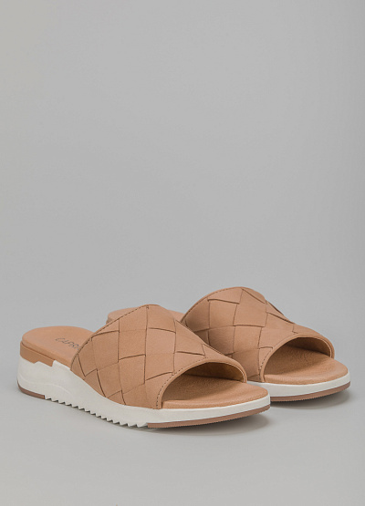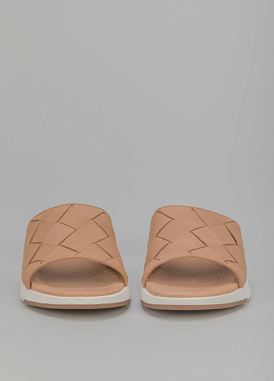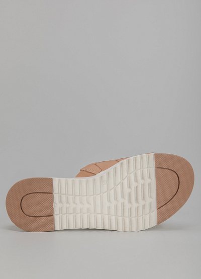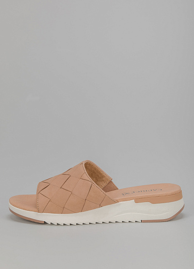 • Пантолеты из натуральной кожи от бренда Tamaris. Модель с открытым носком. Дизайн в виде множественных переплетений. Плоская рифленая подошва.