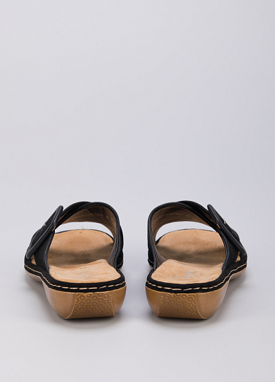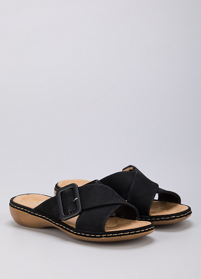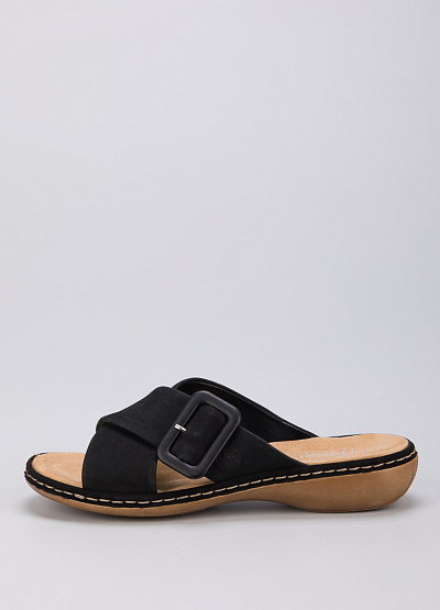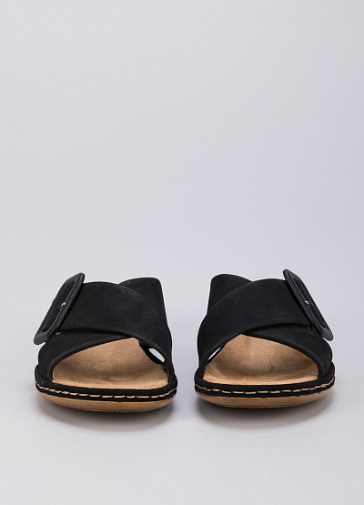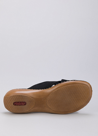 • Пантолеты из натуральной кожи от бренда Rieker. Широкие перекрещивающиеся ремешки. Пряжка на боковой части. Контрастный шов вдоль плоской подошвы с низким каблуком.
