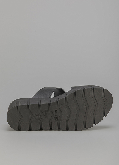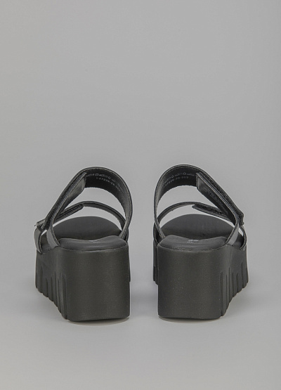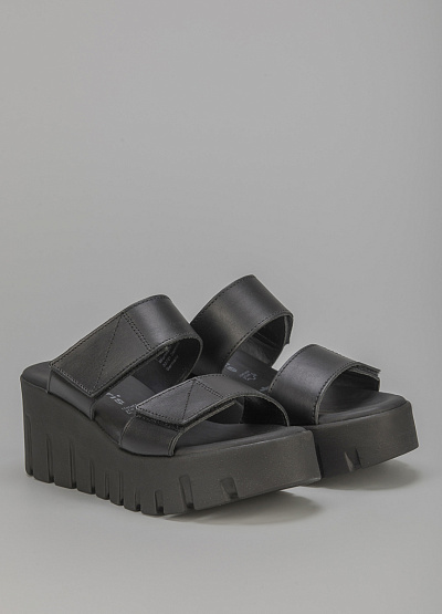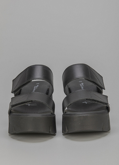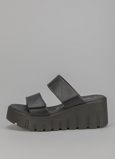 • Пантолеты из натуральной кожи от бренда Tamaris. Модель с открытым мысом. Застежки-липучки. Массивная рифленая танкетка.