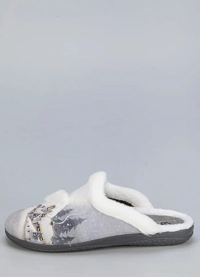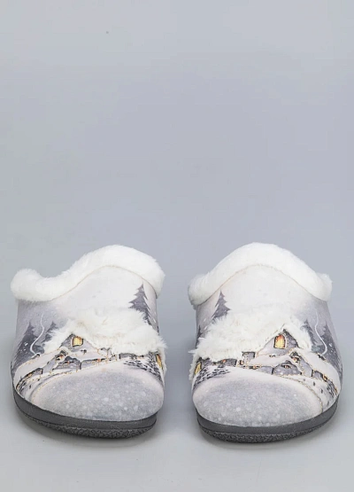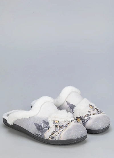 • Светло-серые домашние тапочки Alberola с зимним рисунком и белым мехом — уютная модель, вдохновлённая атмосферой зимнего леса.