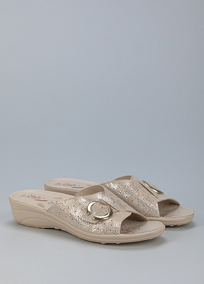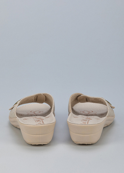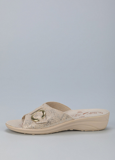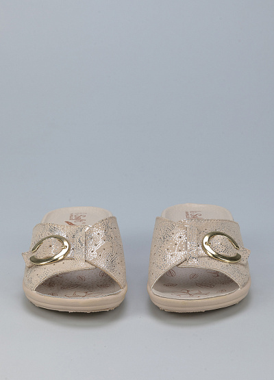 • Женские тапочки от бренда Le Soft. Открытый носок. Декор в виде пряжки. Золотистая фурнитура. Плоская рифленая подошва с небольшим подъемом.