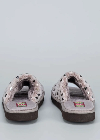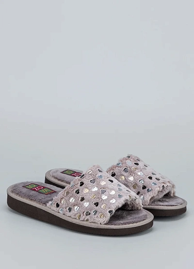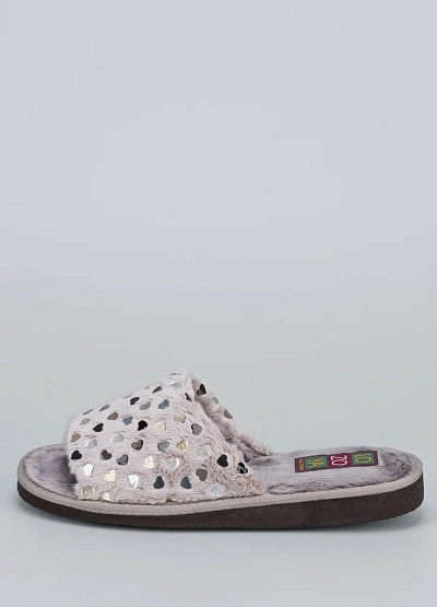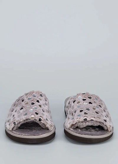 Домашние тапочки с пушистым верхом и декоративными сердечками добавляют игривый акцент в повседневный образ.