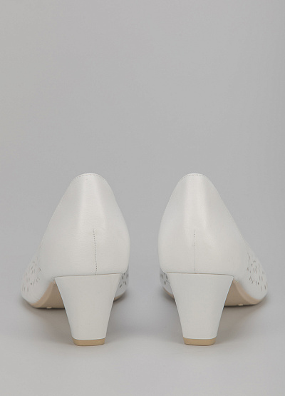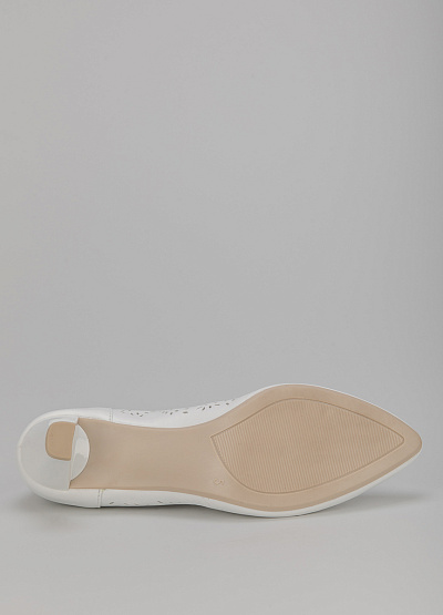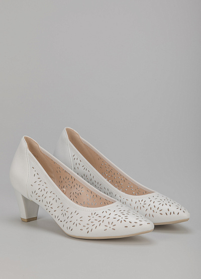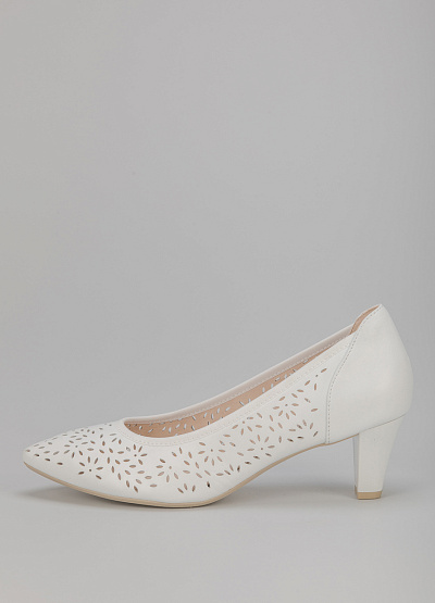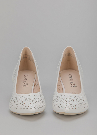 • Туфли белого цвета из натуральной кожи от бренда Caprice. Модель с заостренным носком. Сквозная перфорация. Устойчивый каблук средней высоты.