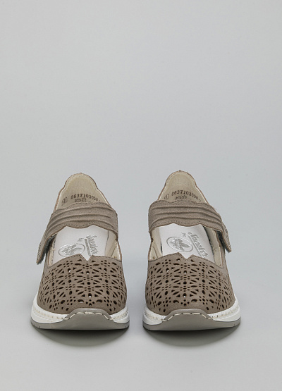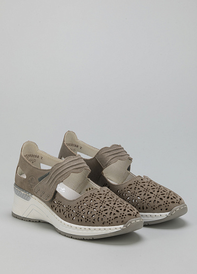 • Женские туфли от бренда Rieker. Закругленный носок. Застежка липучка на подъеме. Сквозная перфорация. Танкетка.