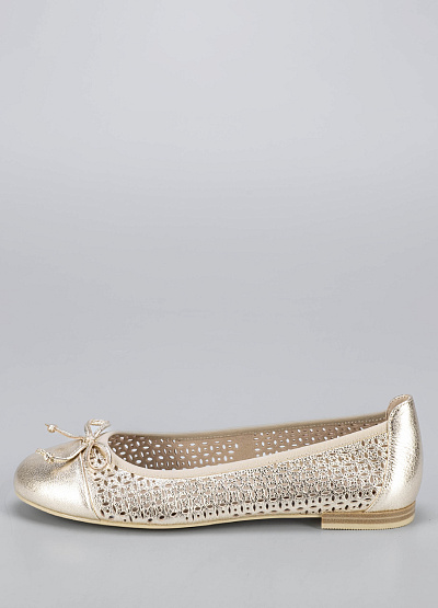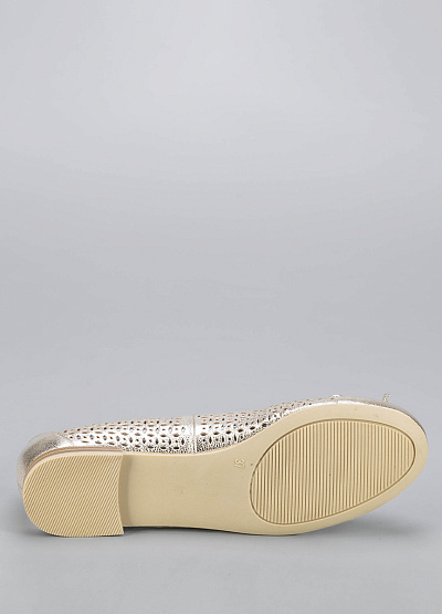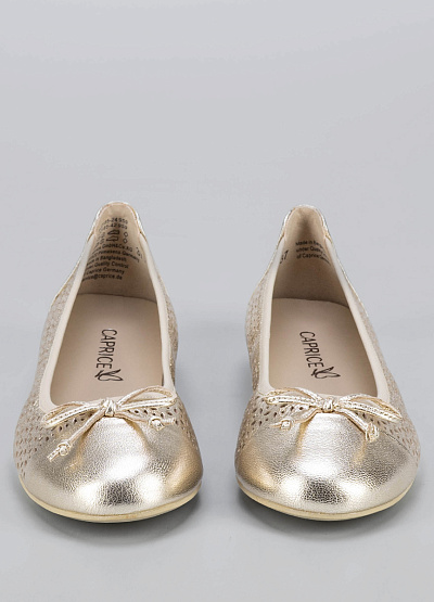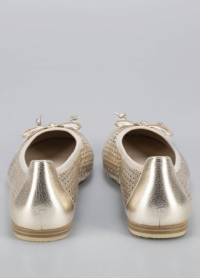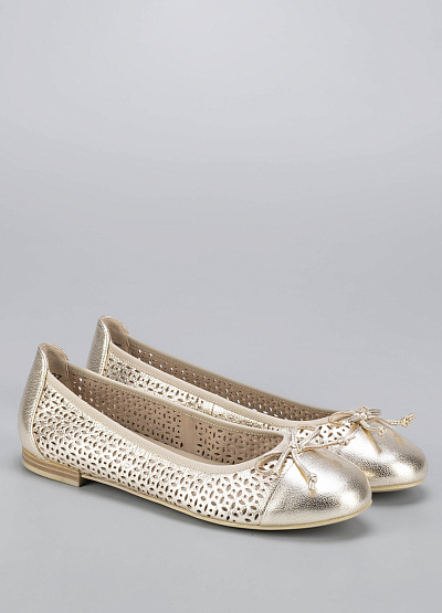 • Женские балетки в благородном золотистом цвете сочетают в себе лёгкость, элегантность и практичность. Перфорация по бокам обеспечивает хорошую вентиляцию, создавая комфорт даже в жаркую погоду. Мягкий верх из кожи с деликатным блеском придаёт образу утончённость. Небольшой декоративный бантик спереди добавляет женственности. Гибкая подошва и удобная посадка делают модель отличным выбором на каждый день. Балетки легко комбинируются с юбками, платьями, джинсами и лёгкими брюками. Идеальны для повседневных образов, прогулок и офиса.