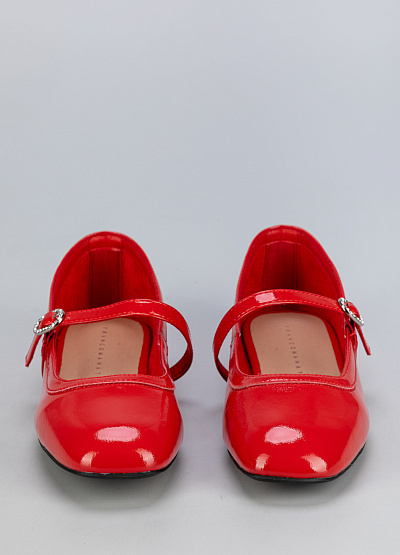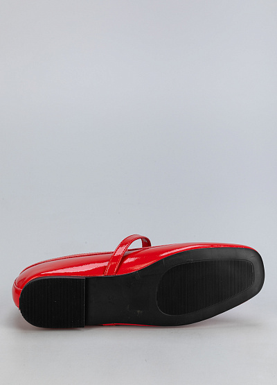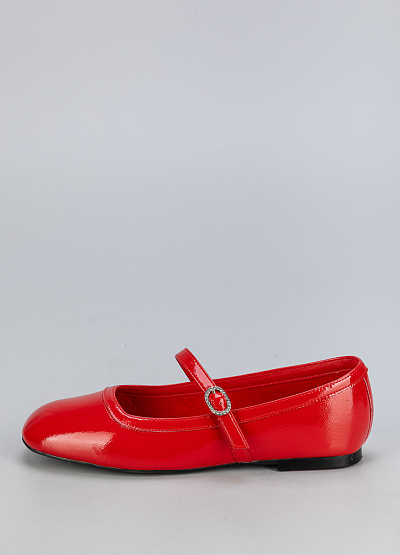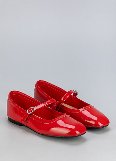 • Женские балетки красного цвета. Обувь имеет классический силуэт с округлым носком и ремешком с небольшой металлической пряжкой. Подошва тонкая и черного цвета. Материал внешней части блестящий, что придает обуви нарядный вид.