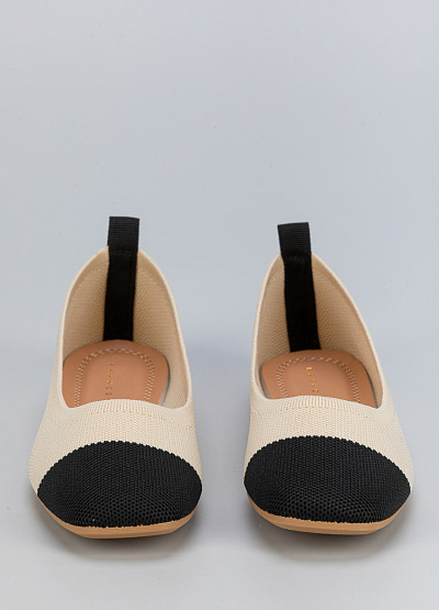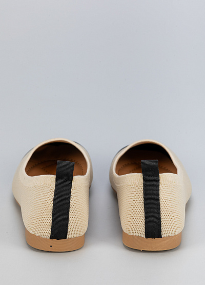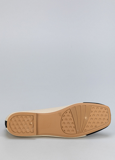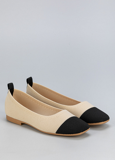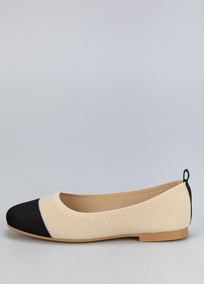 • Женские балетки из текстиля в стильном сочетании бежевого и черного цветов.
