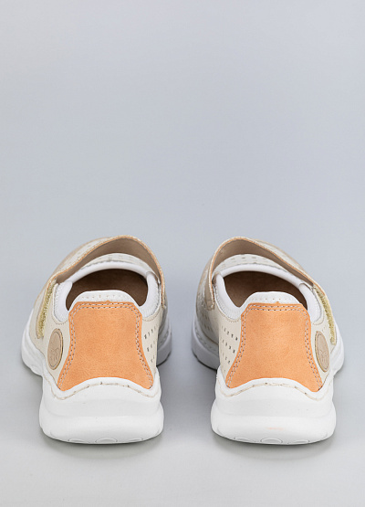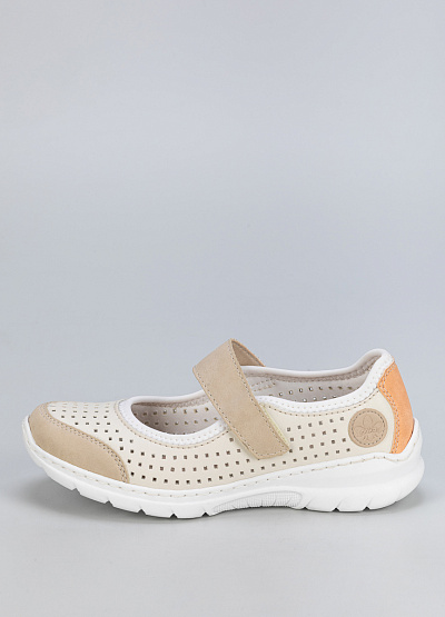 • Женские туфли в светло-бежевом цвете с контрастной вставкой на пятке выполнены в практичном повседневном стиле. Перфорированный верх и застёжка на липучке делают модель удобной и дышащей — идеальный выбор для тёплого сезона.