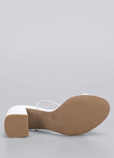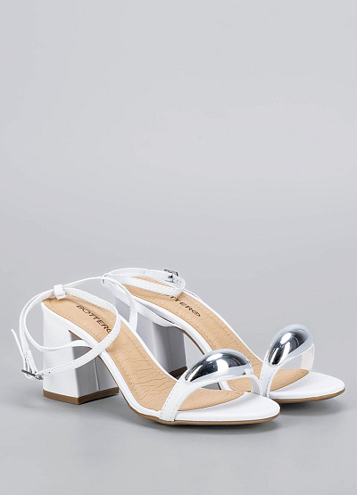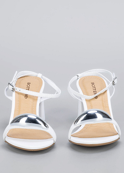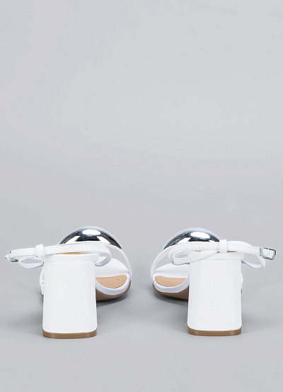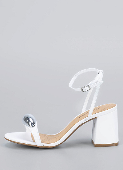 • Минималистичные белые босоножки на каблуке с оригинальной металлической вставкой — выбор для любительниц чистых форм и деталей.