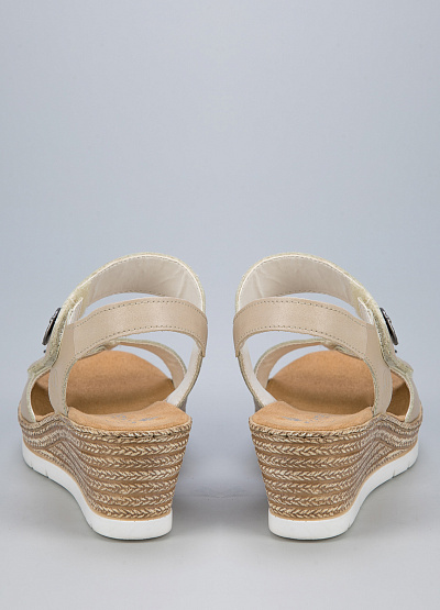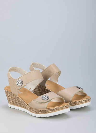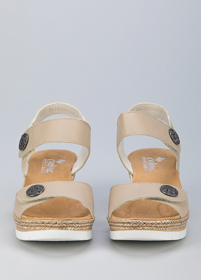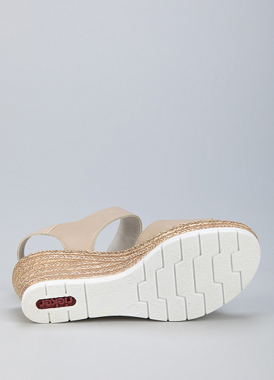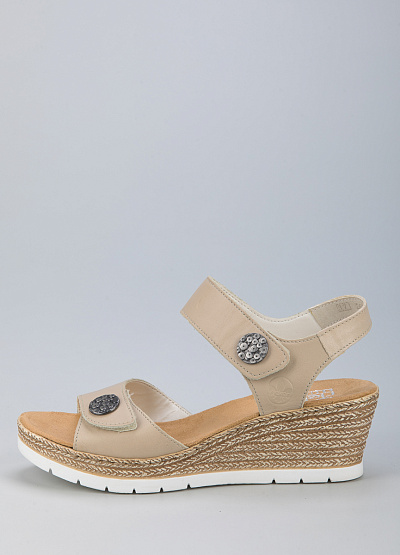 • Босоножки из натуральной кожи и экокожи от бренда Rieker. Застежка-липучка. Декор в виде клепок. Рифленая танкетка.