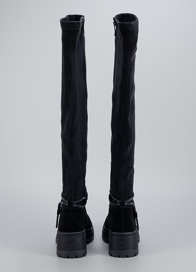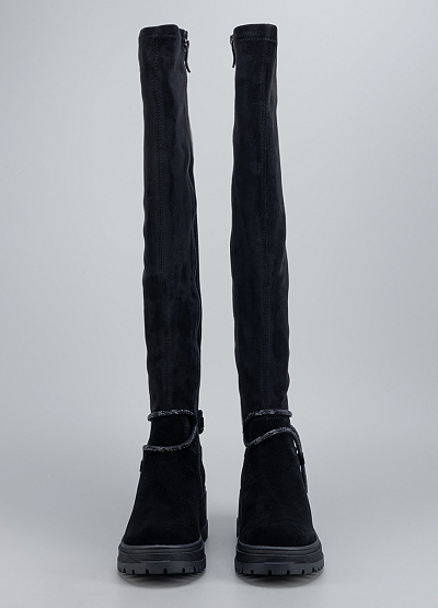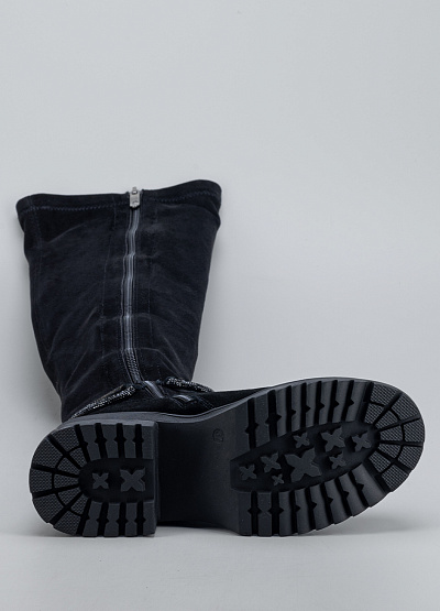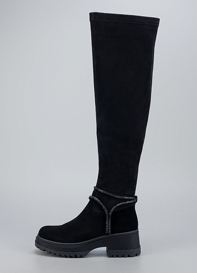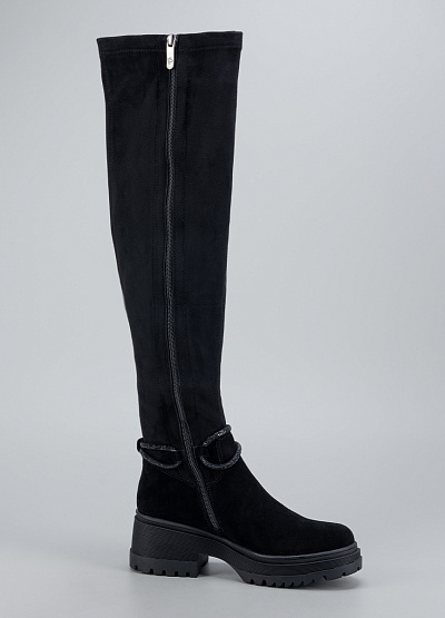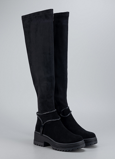 • Женские высокие сапоги Franco Manatti в чёрном цвете — стильная и практичная модель, созданная для комфортной носки в холодный сезон. Верх выполнен из приятного на ощупь материала с бархатистой фактурой, который добавляет образу элегантности. Удлинённая голень визуально вытягивает силуэт, а аккуратный ремешок с декоративным блеском подчёркивает женственность модели. Устойчивая подошва обеспечивает уверенный шаг и отличное сцепление с поверхностью.