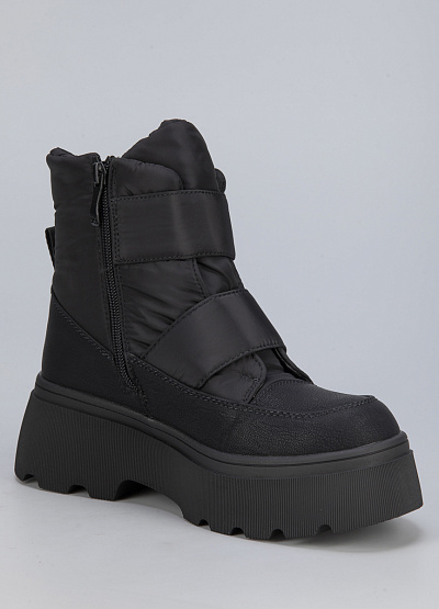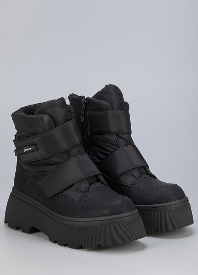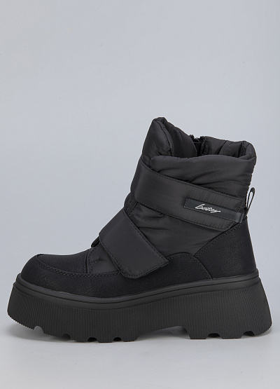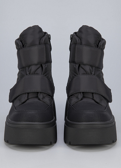 • Женские ботинки из экокожи и нейлона от бренда Betsy. Закругленный носок. Две застежки на липучках, украшенные логотипом. Боковая молния. Петли для подтягивания сзади. Массивная рифленая подошва.
