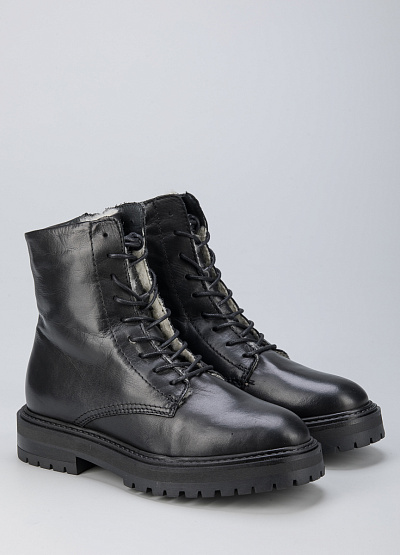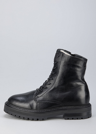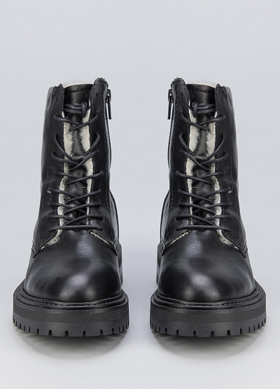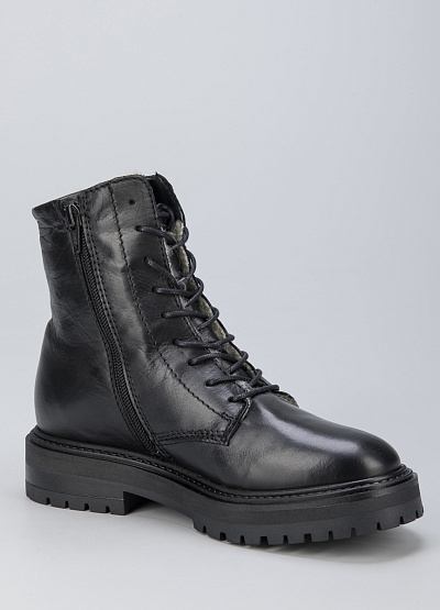 • Женские ботинки из натуральной кожи от бренда Creator. Закругленный носок. Открытая шнуровка в тон. Боковой замок. Массивная рифленая подошва на низком каблуке.