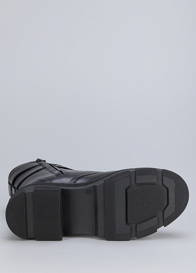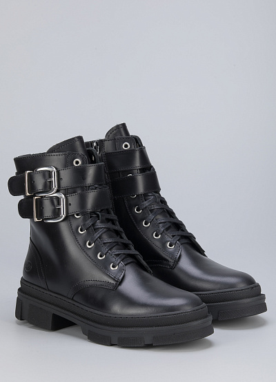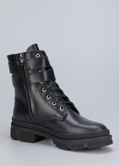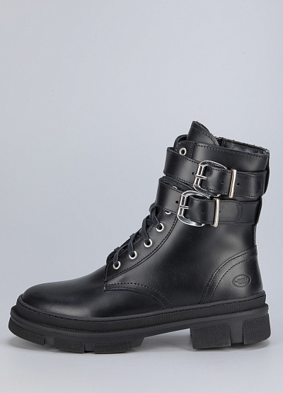 • Женские ботинки из натуральной кожи от бренда Inwood. Закругленный носок. Открытая шнуровка в тон дополнена двумя ремешками на пряжке. Молния сбоку. Петли для подтягивания сзади. Широкая рифленая подошва на низком каблуке.