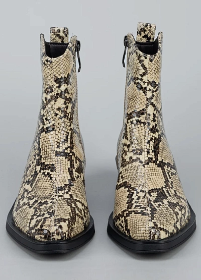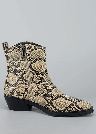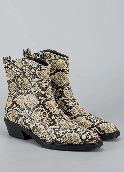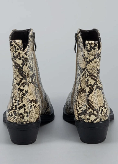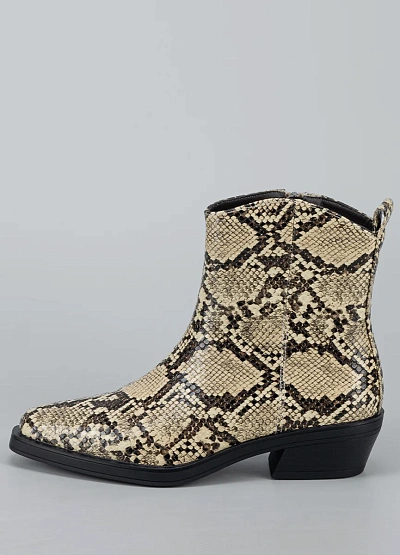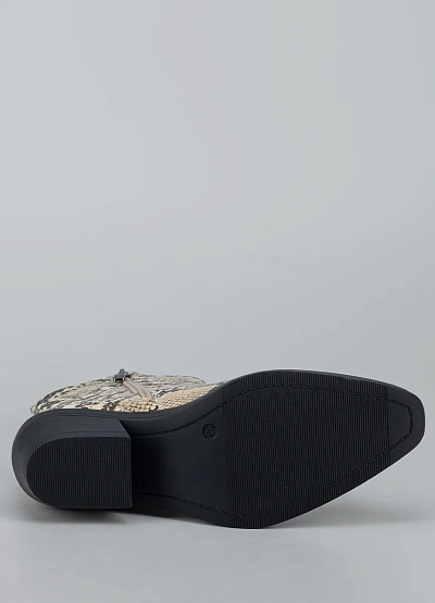 • Стильные женские ботильоны с эффектной отделкой под змеиную кожу — яркий акцент, который способен преобразить любой образ. Модель выполнена из гладкого кожзама с реалистичной фактурой и выразительным рисунком. Устойчивый невысокий каблук придаёт силуэту элегантность, сохраняя комфорт в течение дня. Универсальная форма носка и аккуратный контур делают ботильоны подходящими как для повседневных луков, так и для выходных образов с характером.
