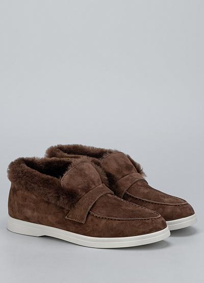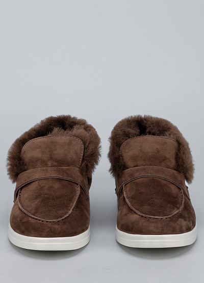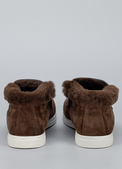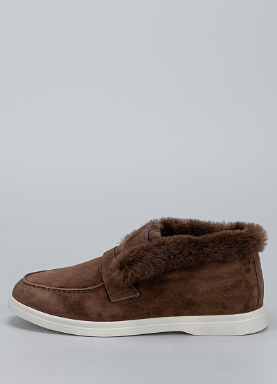• Уютные зимние мужские ботинки-домашки в тёплом коричневом цвете — идеальный выбор для холодного сезона. Мягкий ворсистый мех внутри обеспечивает максимальный комфорт и тепло, а внешний материал напоминает замшу и создаёт стильный, аккуратный вид. Белая облегчённая подошва добавляет современности и делает модель комфортной для повседневного ношения дома или на даче.