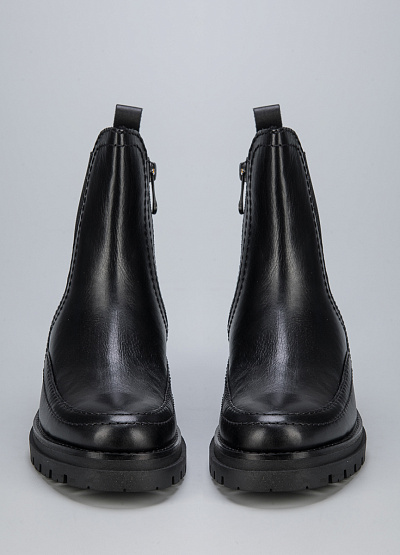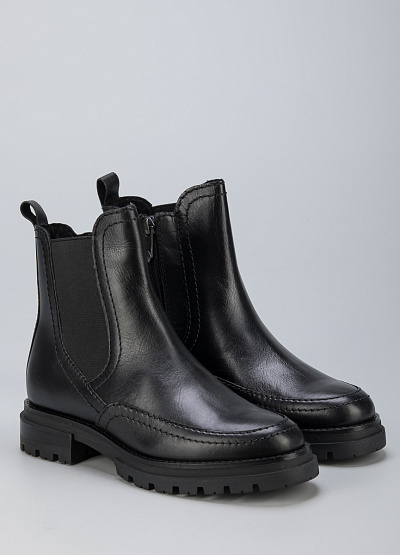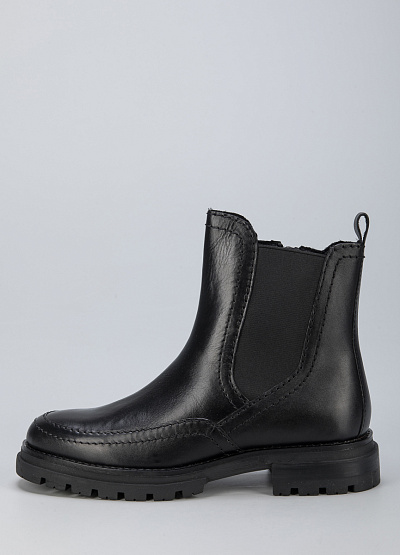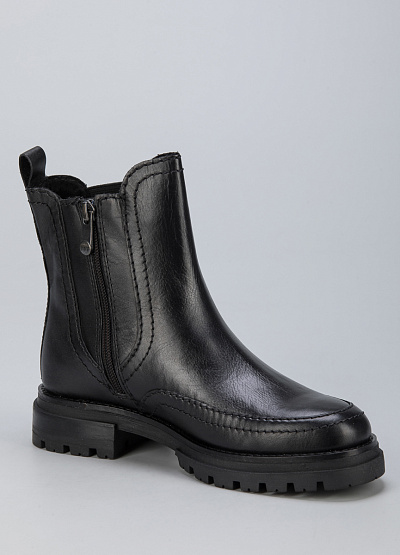 • Женские ботинки из натуральной кожи от бренда Marco Tozzi. Закругленный носок. Эластичная вставка сбоку. Боковая молния. Петли для подтягивания сзади. Массивная рифленая подошва на низком каблуке.