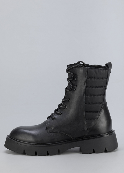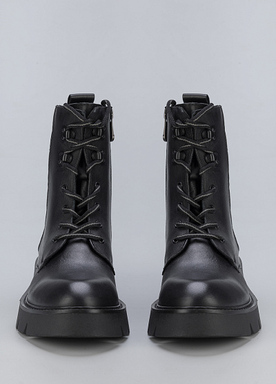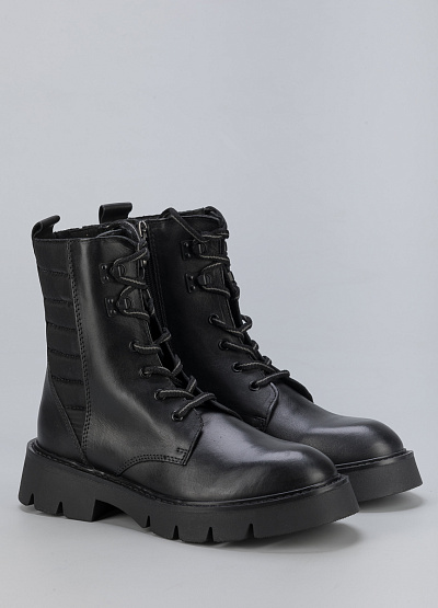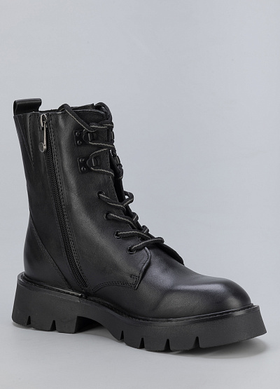 • Женские ботинки из натуральной кожи от бренда Marco Tozzi. Закругленный носок. Открытая шнуровка в тон. Боковая молния. Петли для подтягивания сзади. Массивная рифленая подошва.