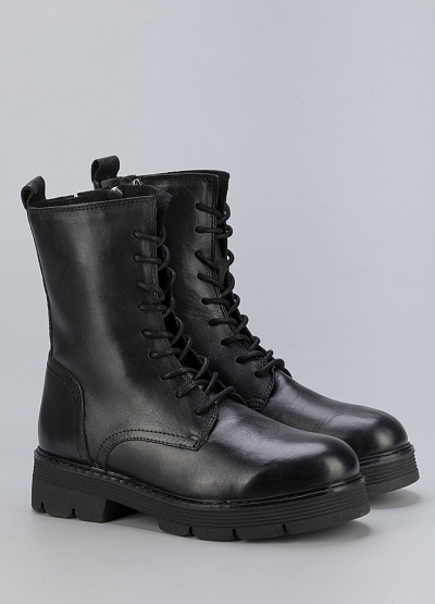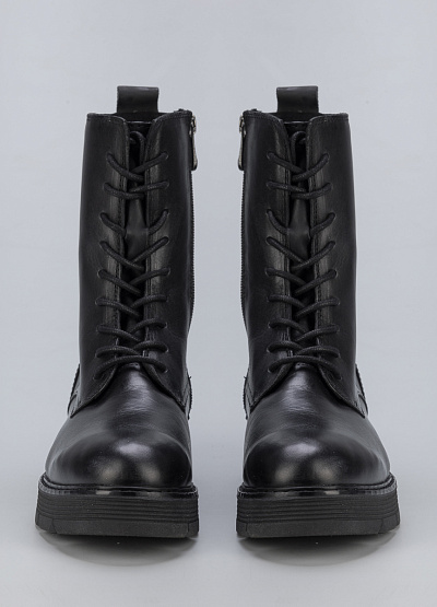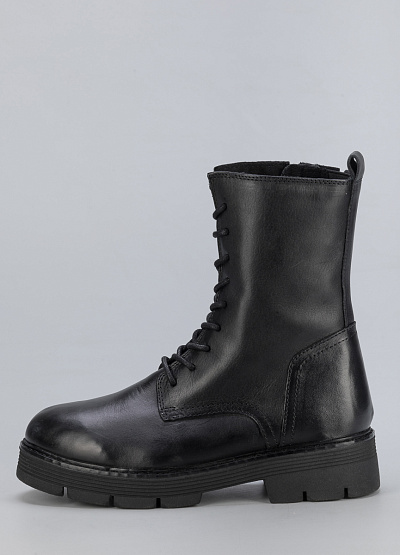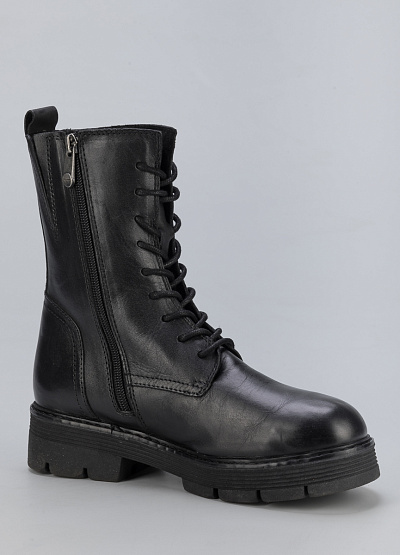 • Женские ботинки из натуральной кожи от бренда Marco Tozzi. Закругленный носок. Открытая шнуровка в тон. Боковая молния. Петли для подтягивания сзади. Массивная рифленая подошва.