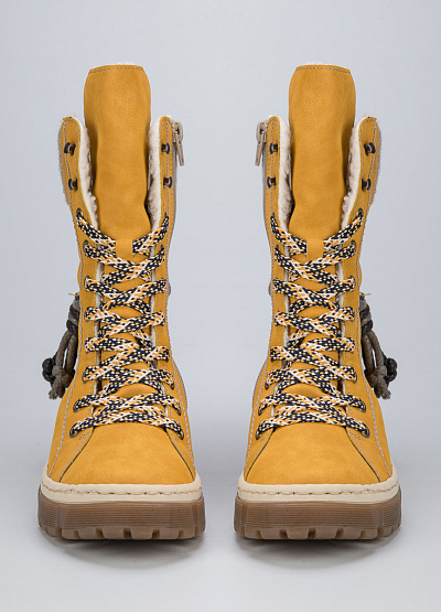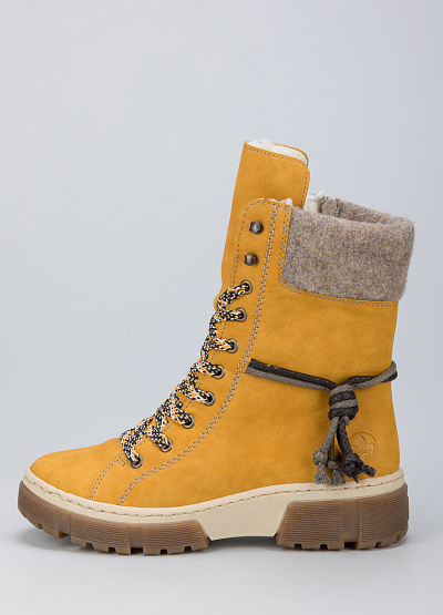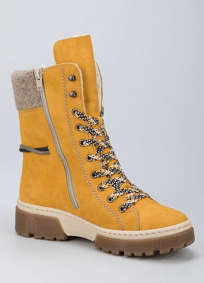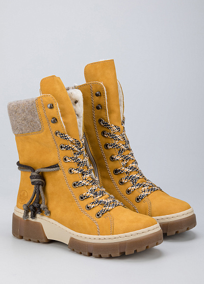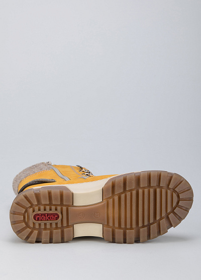 • Женские ботинки из экокожи и текстиля от бренда Rieker. Закругленный носок. Контрастная шнуровка в тон. Боковая молния. Декор в виде узла из жгутов. Массивная рифленая подошва.